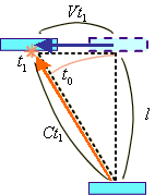 次は、私から見たあなたの時計の解析。図3−2の様に、光が到着するまでに鏡は当然移動する。したっがってt