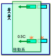 二つ目の光時計は移動系として、我々の静止系の中を通りすぎて行く。速度は光速の半分の0.5Cだ。