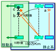 静止している光時計では10秒後に反対側の鏡(a地点)にレーザーパルスが到着する。 その時点で移動系の鏡は150万キロメートル進んでいますな。