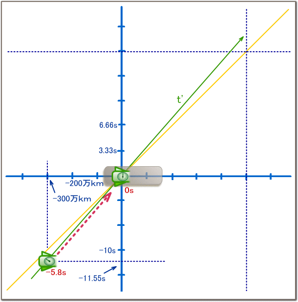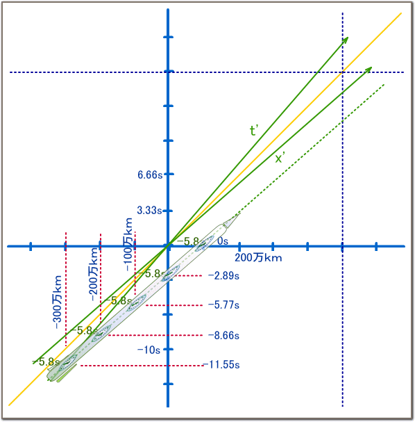 ロケット前端の時計-5.8Sに対応するS系での時空間座標は-300万km、-11.55sの点だ。 11.55s後に原点に到着する。 赤い点線で示す通り、この軌跡はS’系の時間軸t’と同じだ。