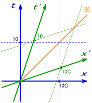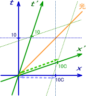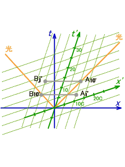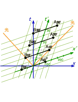 同様に、B10'-A10'の様に移動系S'での同一時刻を繋げたものが空間軸です。これも斜めに傾いています。
