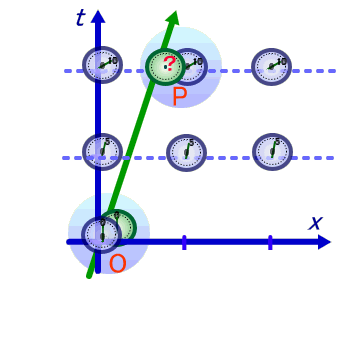 図7−7を例に取て説明しましょう。 原点Oで時刻[0秒]の移動系の時計がP点に移動したとする。この場合、Pにおける移動系の時計の時刻[?]は、静止系の時計の時刻に対して の少ない時刻を指している事になる。