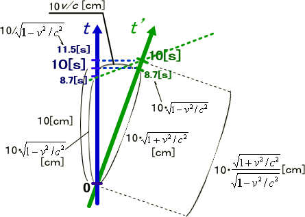 ところでS系では時間軸10秒上にP点があります。またS'系ではP点は8.7秒でした。これはP点のS’系時間軸t’上の目盛と考えてよいはずです。