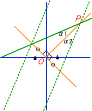 原点Oを挟んで等距離の任意の平行線に対して、原点を通る全ての直線は、マル印の様に等距離になります。よって、光の軌跡45度線O,Pを挟むα1,α2の角度は等しくなります。