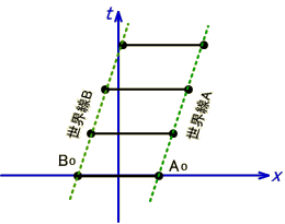 実験装置は移動系S'上で静止しているため、A点、B点それ真上に伸びた世界線となります。